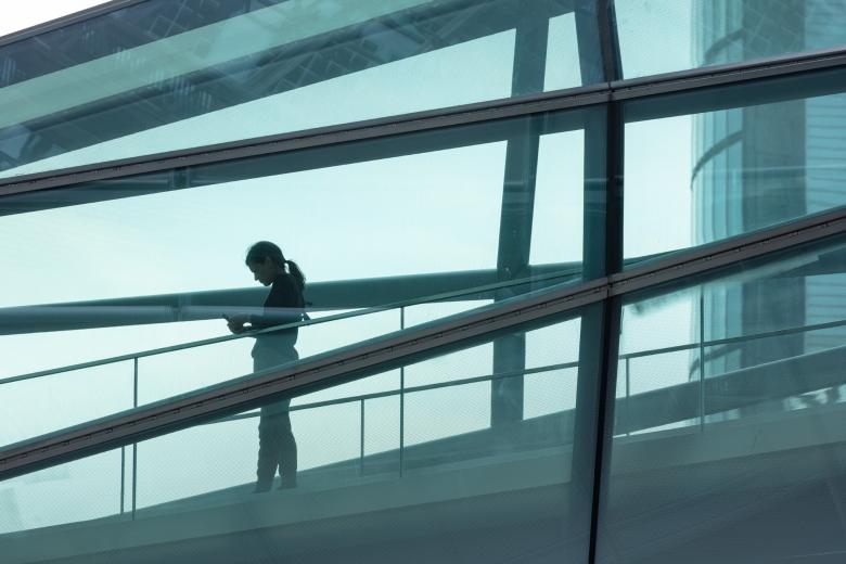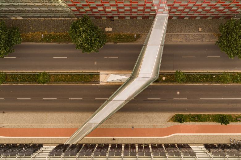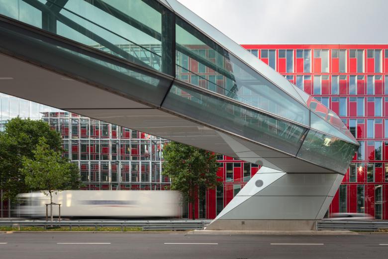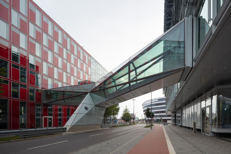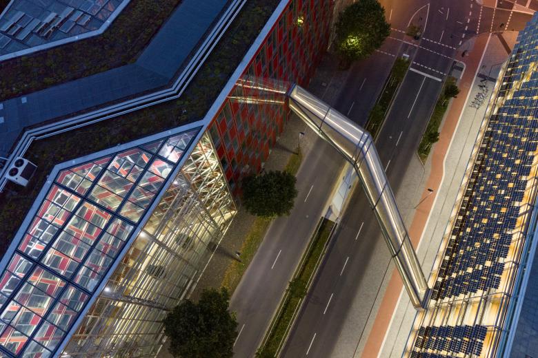Die Glasbrücke von supergelb Architekten - auch Capricornbrücke genannt - verbindet zwei Gebäude des Uniper Headquarters im Düsseldorfer Medienhafen: das Capricornhaus von GATERMANN+SCHOSSIG und das FLOAT von Renzo Piano Building Workshop.