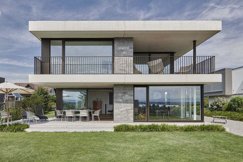 Vom Grundstück an leichter Hanglage geniesst man einen herrlichen Blick auf den Pfäffikersee und das breite Alpenpanorama. Der Entwurf reagiert mit maximaler Öffnung nach vorne und bescheidener Fensterfläche nach Norden.