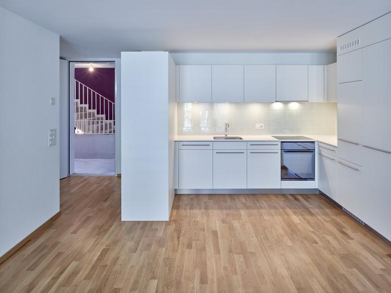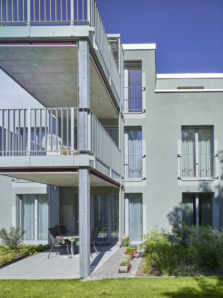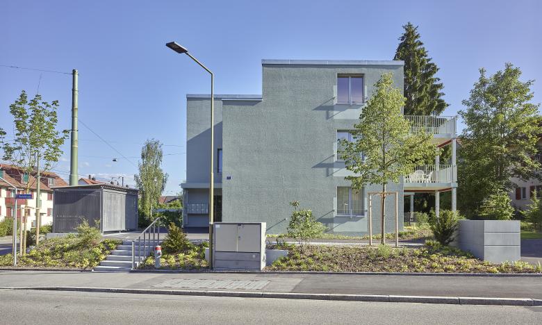 Der Neubau steht neu parallel zur lärmbelasteten Stadlerstrasse in der Wohnzone W2/2.0. Im Bereich der Kreuzung wird der Bau dreigeschossig und definiert so die Eingangssituation. Lärmabgewandt gegen Westen orientieren sich die Wohnräume und Balkone. Trotz der nun verschärften Lärmschutzpolitik wurden Wohnungen entwickelt, welche die Strasse nicht von den Wohnungen verbirgt, sondern durch diese spannende Innenräume erzeugt werden können.