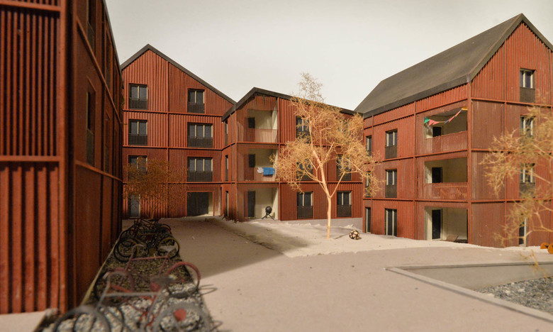 Die Reihung von giebelständigen Häusern ermöglicht mit zusätzlichen Fassadenflächen eine optimierte Tageslichtausnutzung. Die im Norden tieferen Traufhöhen begünstigen ausserdem die Besonnung der Nachbarwohnungen und Gärten. Das bestehende Bauernhaus und der Schopf werden respektvoll und ebenbürtig in die Umgebungsgestaltung integriert und kommen so gestärkt zur Geltung. Analog der “kleinteiligen” Form mit Giebeldächern stellt auch die verschieden strukturierte Holzfassade den Bezug zum dörflichen Kontext dar.