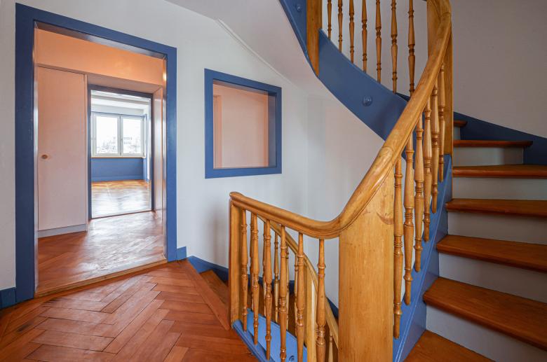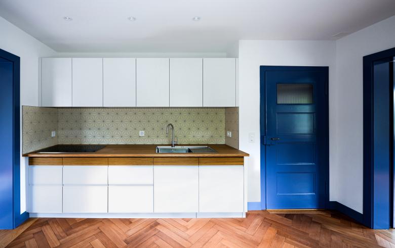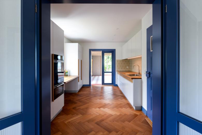 Mit dem Umbau wurde einerseits eine energetische Sanierung mit Sole-Wasser-Wärmepumpe vorgenommen, andererseits die Raumaufteilung den neuen Anforderungen angepasst, ohne die Zeitspuren dabei ganz zu verwischen. Der Aufbau seitens Garten ermöglichte im ersten Stock eine Ergänzung des Raumangebotes der Familienwohnung um ein helles Jahreszeitenzimmer. Die Zimmer sind dabei enfilade-artig miteinander verbunden und vermitteln ein grosszügiges Raumgefühl. Alle Oberflächen wurden komplett saniert, der Fischgratboden und die alten Fliesen freigelegt und aufgefrischt. Das Dachgeschoss wurde mit zwei Kinderzimmern und einem Badezimmer vollständig ausgebaut und erweitert so das Platzangebot der Familienwohnung.