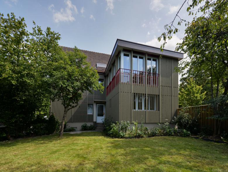 Die prominent zum Breiteplatz ausgerichtete Fassade mit Erker und Türmli wurde von innen neu gedämmt. Richtung Garten wurde die Dämmung aussen mit Holzschalung aufgedoppelt und fasst den Anbau mit der zusätzlich geschaffenen Aufstockung mit ein.