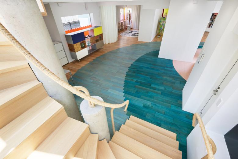 The interior of the space is so colorful and embodies Tsumori’s image that it is hard to imagine from the simple white exterior. The colors that appear in various places, doors, walls, flooring, counters, etc., together with the characteristic materials and light coming in through the large windows, balance each other like natural flowers blooming in a field, creating a delightful space.