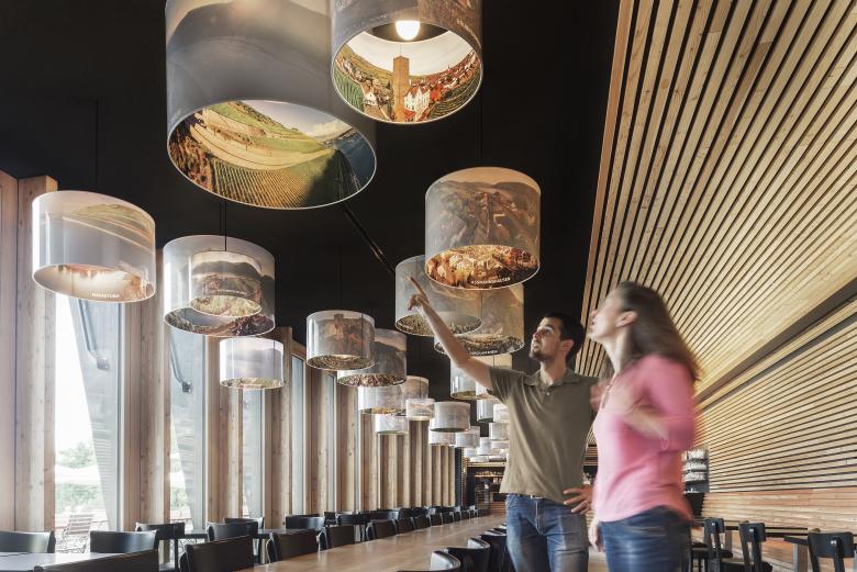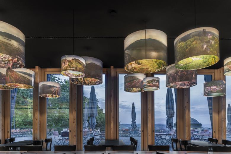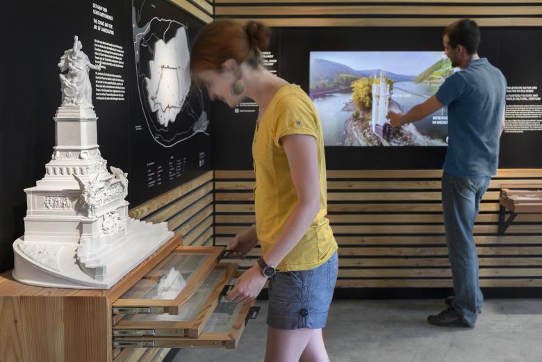 Beim Eintritt in das Besucherzentrum werden die Gäste thematisch und geografisch an den Ort heran geführt: von einer Übersicht über den Rheinverlauf, über das Obere Mittelrheintal zum Niederwald, bis zu einem Modell des Niederwalddenkmals. Auf »seamless screens« kann der Besucher sich anhand von fotografischen Panoramen auf die Reise über das Obere Mittelrheintal begeben. Im Gastronomiebereich lädt eine lange Tafel dazu ein, sich zur »Rast« niederzulassen. Lampenschirme zeichnen mit 360°-Panoramen den Rheinverlauf von Bingen nach Koblenz nach. Sie verbinden Kommunikations- und Gastronomiebereich sowohl thematisch als auch räumlich.