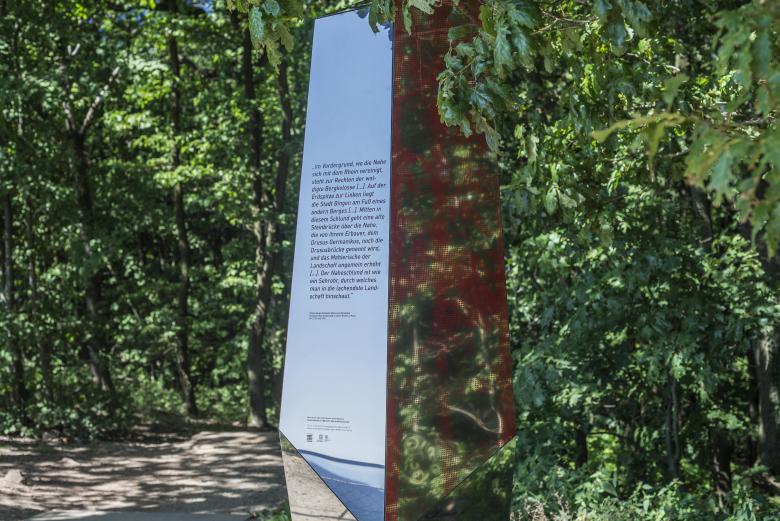 Unter dem Motto »Rhein. Reise. Rast.« wird der Besucher mit auf eine Entdeckungsreise durch die Region und ihre Geschichte(n) genommen. Im Park bietet ein Leitsystem aus Informationsstelen inhaltliche wie räumliche Orientierung. Allseitig verspiegelte Flächen lassen die Stelen fast gänzlich unsichtbar wirken, die Informationsebene hebt sich durch eine rote Trägerplatte hervor.