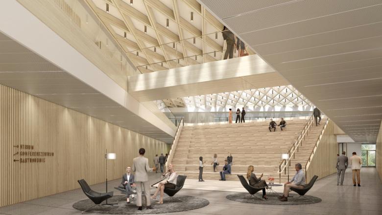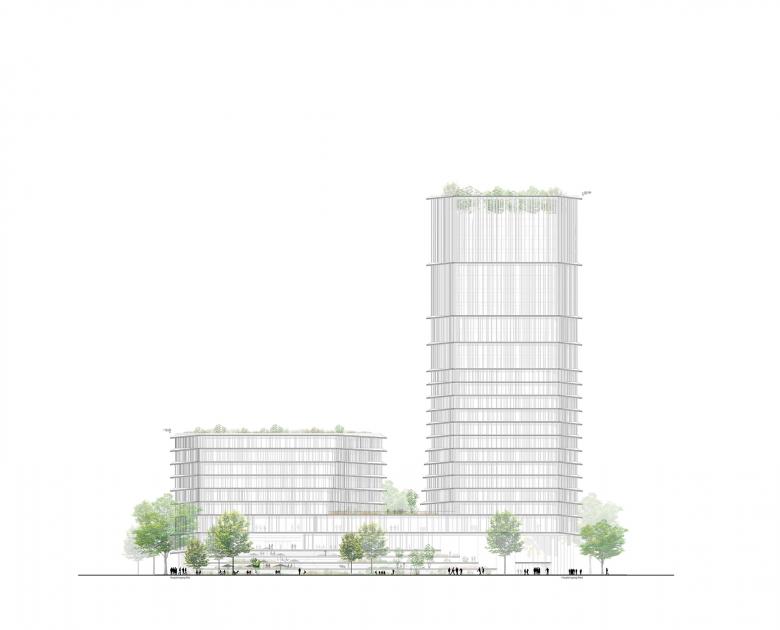 Auf einem rheinnahen Grundstück im Zentrum des Regierungsviertels und als Teil des „Blaugrünen Rings“ wird ein Neubaufür verschiedene Nutzer des Landes NRW entstehen. Fernwirksamer Bestandteil ist ein Holz-Hybrid-Hochhaus mit einer Gesamthöhe von über 110 Meter.