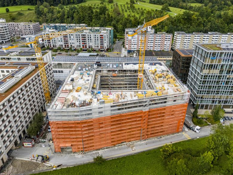 Der Betonanteil wird oberirdisch durch einen Betonskelettbau markant gesenkt und in der Holzfassade werden nachwachsende und wenig verarbeitete Rohstoffe eingesetzt. Ein ausgewogener Fensteranteil optimiert die die Tageslichtnutzung, Wärmegewinne und -verluste im Winter, den Schutz vor Überhitzungen und der Verbrauch von Grauer Energie. Das Gebäude wird in das Wärmenetz des Areals eingebunden und zusätzlich mit einer PV-Anlage ausgestattet.