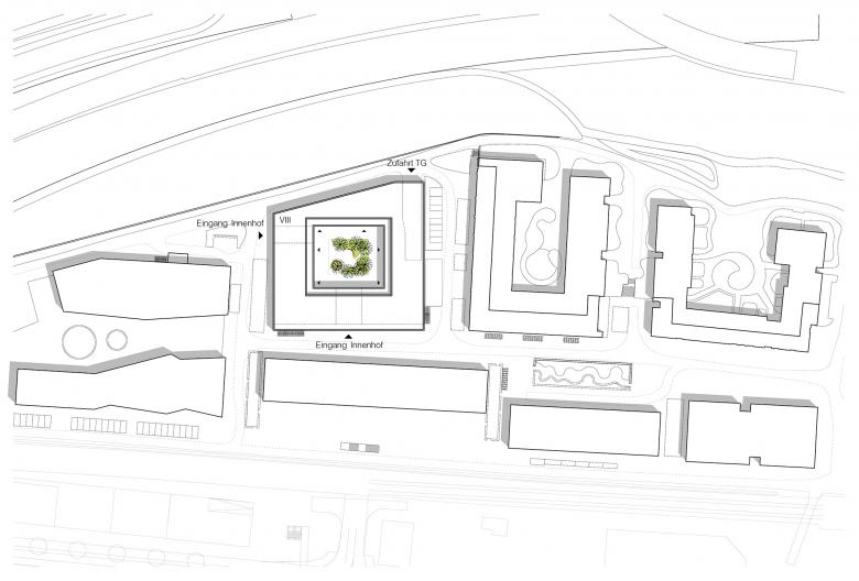 Die Arkaden am Maneggplatz laden dazu ein, den begrünten Innenhof zu betreten. Der Neubau wird von dort über sechs Treppenhäuser erschlossen, welche das Bauvolumen in überschaubare Einheiten gliedern.