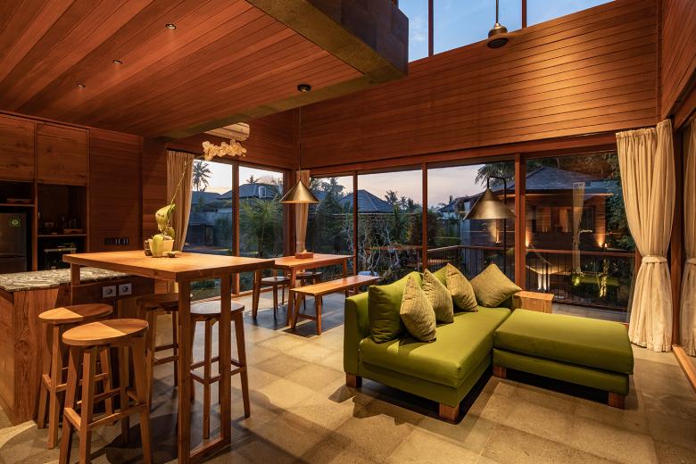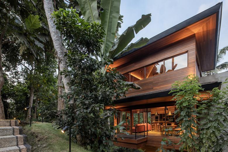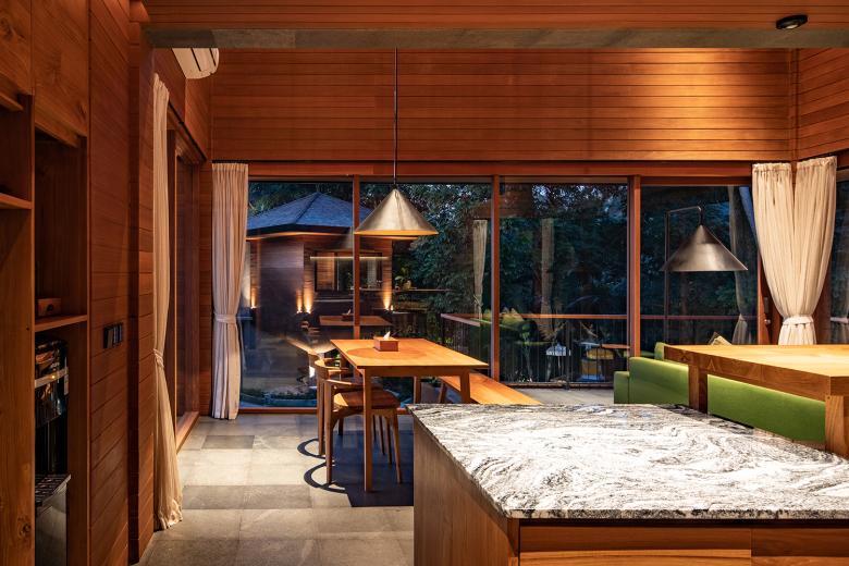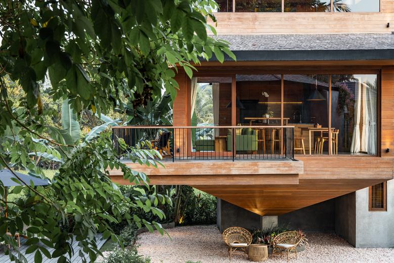 Dafür erfüllt jedes Haus eine bestimmte Funktion und bietet Platz für insgesamt bis zu zehn Gäste. Durch die erhöhte Bauweise haben die Bewohner einen atemberaubenden Blick auf die Umgebung und profitieren gleichzeitig von einer angenehmen Brise, die durch die offene Architektur optimal genutzt wird. Besonderer Wert wurde auf die Integration der vorhandenen Vegetation gelegt. Große Bäume wurden bewusst in die Architektur integriert, spenden natürlichen Schatten und schaffen Privatsphäre. Die Bauweise respektiert die Umwelt und verwendet nachhaltige Materialien wie Holz, das sowohl für die Außenfassade als auch für den Innenausbau verwendet wurde. Die warmen Holztöne schaffen eine angenehme, natürliche Atmosphäre und verstärken das Gefühl, eins mit der Umgebung zu sein. Ein weiteres prägendes Gestaltungsmerkmal ist das Lichtkonzept von studio nimmersatt. Indirektes Licht setzt Akzente und schafft eine stimmungsvolle Atmosphäre, so dass die Häuser bei Dunkelheit wie leuchtende Laternen im dichten Grün des Regenwaldes erscheinen. Die offene Gestaltung der Räume fördert den Dialog zwischen Innen und Außen und ermöglicht ein intensives Naturerlebnis.