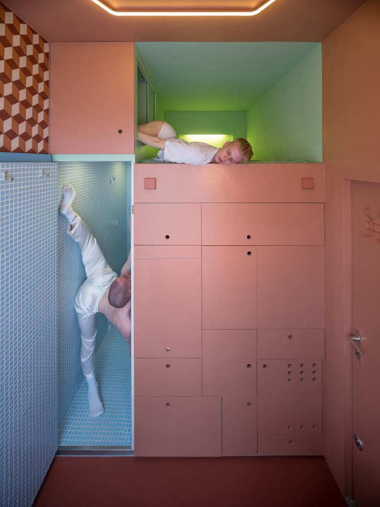 Die Architektur basiert auf einem präzisen Raumkonzept: Vier autonome Bereiche mit jeweils unterschiedlichen Materialien und Raumhöhen maximieren die Nutzung der begrenzten Fläche. Die Dimensionierung ergab sich aus den individuellen Bedürfnissen und Maßen der Nutzer - die Architekten wurden sozusagen zu ‚Modulor‘ ihres eigenen Raumes. Der Wohnbereich mit Küche ist mit 3 m Höhe großzügig, der Schlafbereich mit 1,14 m Höhe bewusst kompakt gehalten. Die Dusche mit WC und das Spa, der einzige geschlossene Bereich, sind funktional optimiert, so dass jeder Quadratzentimeter eine bestimmte Aufgabe erfüllt. Ein 6 m² großes Fenster öffnet den Raum zur Stadt und verstärkt trotz der kleinen Grundfläche das Gefühl von Weite. Die Materialwahl folgt einem pragmatischen Ansatz. Statt der ursprünglich geplanten hochwertigen Oberflächen wie grüner Marmor, weißes Mosaik oder blaue Zementfliesen wurden erschwingliche Alternativen aus Outlet-Stores gewählt - schwarze Marmorplatten aus den 1980er Jahren für das Spa, blaues Mosaik für die Dusche und warme Korallentöne für den Wohnbereich. Aus dieser Materialwahl erfolgte auch die Auswahl der Schalterserie LS 990 Les Couleurs® Le Corbusier in 32111 l’ocre rouge moyen. Das einzige bewusst gewählte Farbelement ist das mintgrüne Schlafzimmer, das mit seiner sanften Beleuchtung einen gemütlichen Rückzugsort schafft.