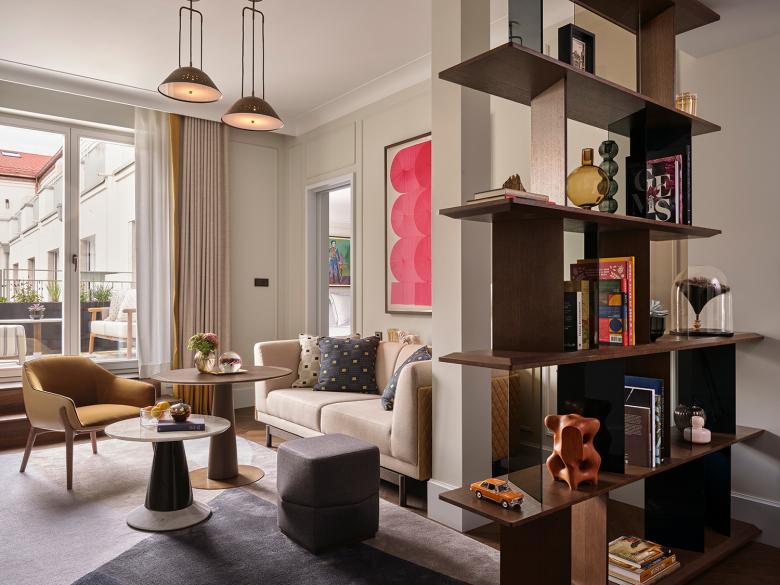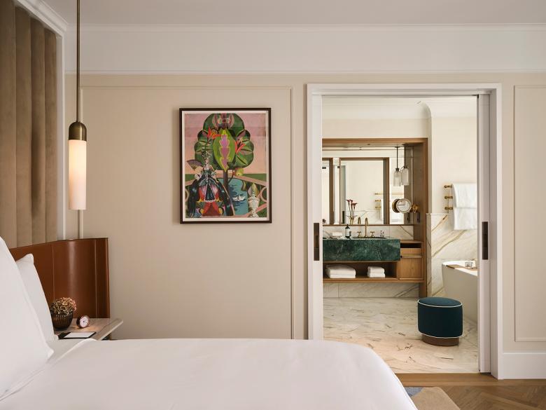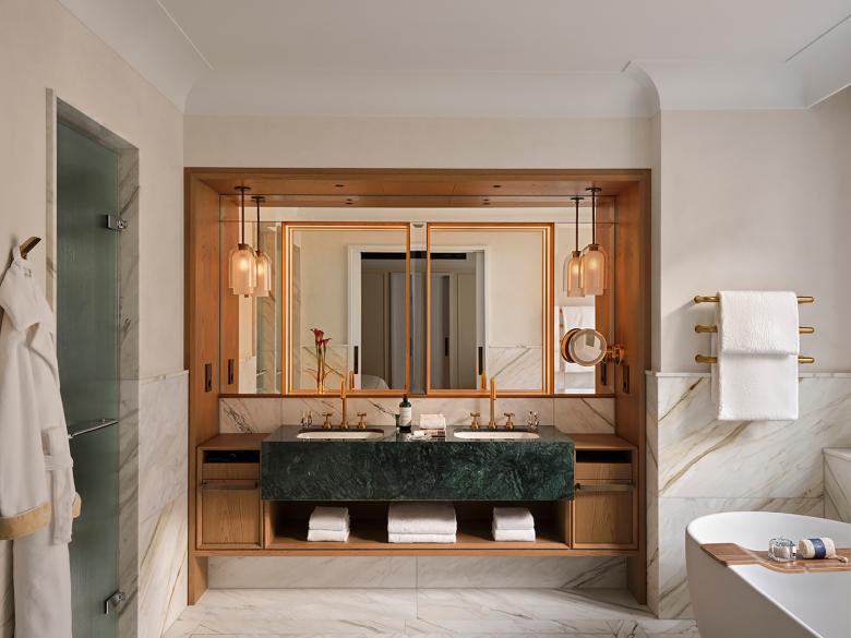 Tara Bernerd & Partners aus London entwarfen das Interieur der Zimmer, Suiten und Häuser sowie die Lobby, den Palaishof und das Spa. Mit hochwertigen Materialien wie Samt, Tweed und Leder schufen sie in den individuellen Gästezimmern ein Design, das historische Grandezza mit zeitgenössischer Raffinesse verbindet. Passend dazu kamen die eleganten Schalter und Steckdosen LS 990 von JUNG in Messing Antik zum Einsatz, die ebenfalls eine Symbiose aus moderner Form und historisch anmutendem Material darstellen. Eine ideale Kombination für die noblen Gästezimmer.