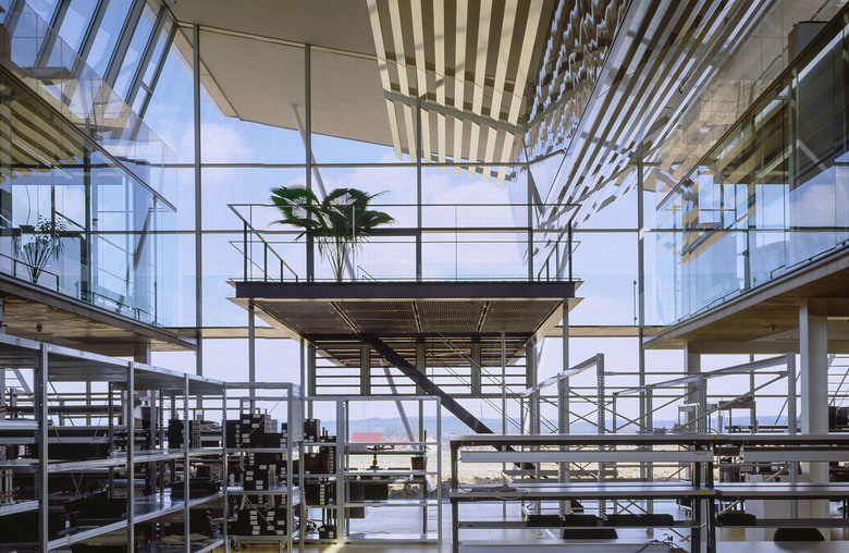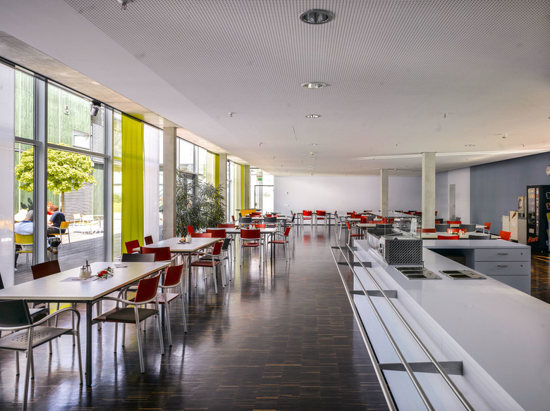 Mit anderen Mitteln wurden die bestehende Struktur und der Rhythmus des Gebäudes fortgesetzt. Ein kompaktes Volumen mit atmosphärischen Innenhöfen ergänzt die markanten offenen Riegel mit signifikanten Dachelementen nach Süden. Die Stahlbetonkonstruktion wirkt äußerlich gleich dem ursprünglichen Stahlbau, besitzt aber eine völlig veränderte innere Aufteilung. Nach wie vor sind die Bereiche so organisiert und einander zugeordnet, dass eine selbstverständliche Kommunikation aller Mitarbeiter erreicht wird. Bürobereiche vermischen sich hier aber mit Laboren und Arbeitsplätzen und Räumen unterschiedlicher Anforderungen. Eine Mensa entlang des großen Innenhofes ergänzt zusätzlich die Versorgung der Mitarbeiter.