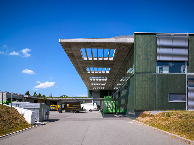 Die Lage im Gewerbegebietes Dreißigacker am Stadtrand von Meiningen ist geprägt von einem leicht abfallenden Hang mit guter Aussicht nach Süden und Osten. Die Erschließung erfolgt von Westen mit einer angegliederten Parkfläche, die Anlieferung erfolgt von der Seite störungsfrei zum Haupteingang. Zum Zugang hin erscheint das Gebäude eingeschossig und öffnet sich zur Landschaft hin zweigeschossig und transparent mit Ausblick nach Osten Richtung Meiningen.