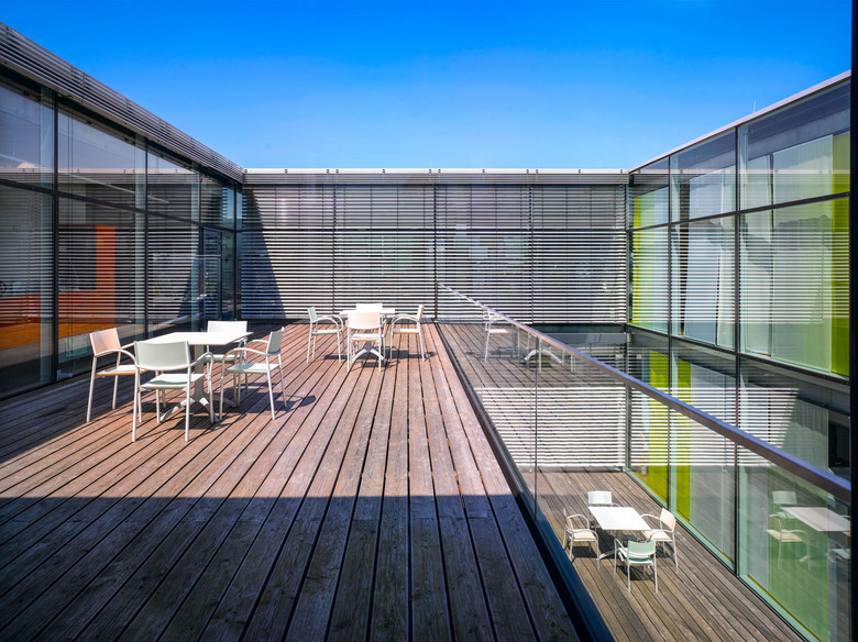 Die signifikanten Dachelemente mit integrierter Lichtlenkung des ersten Bauabschnittes ermöglichen Tagesbelichtung an allen innen liegenden Arbeitsplätzen und bilden gleichzeitig zeichenhaft ein Stück Firmenidentität nach Außen ab. Die Innenhöfe des zweiten Bauabschnittes setzen diesen Rhythmus fort und ermöglichen ebenso eine gezielte Tagesbelichtung der Arbeitsplätze. Darüber hinaus sind Sie Treffpunkt und atmosphärische Aufwertung der Innenräume.