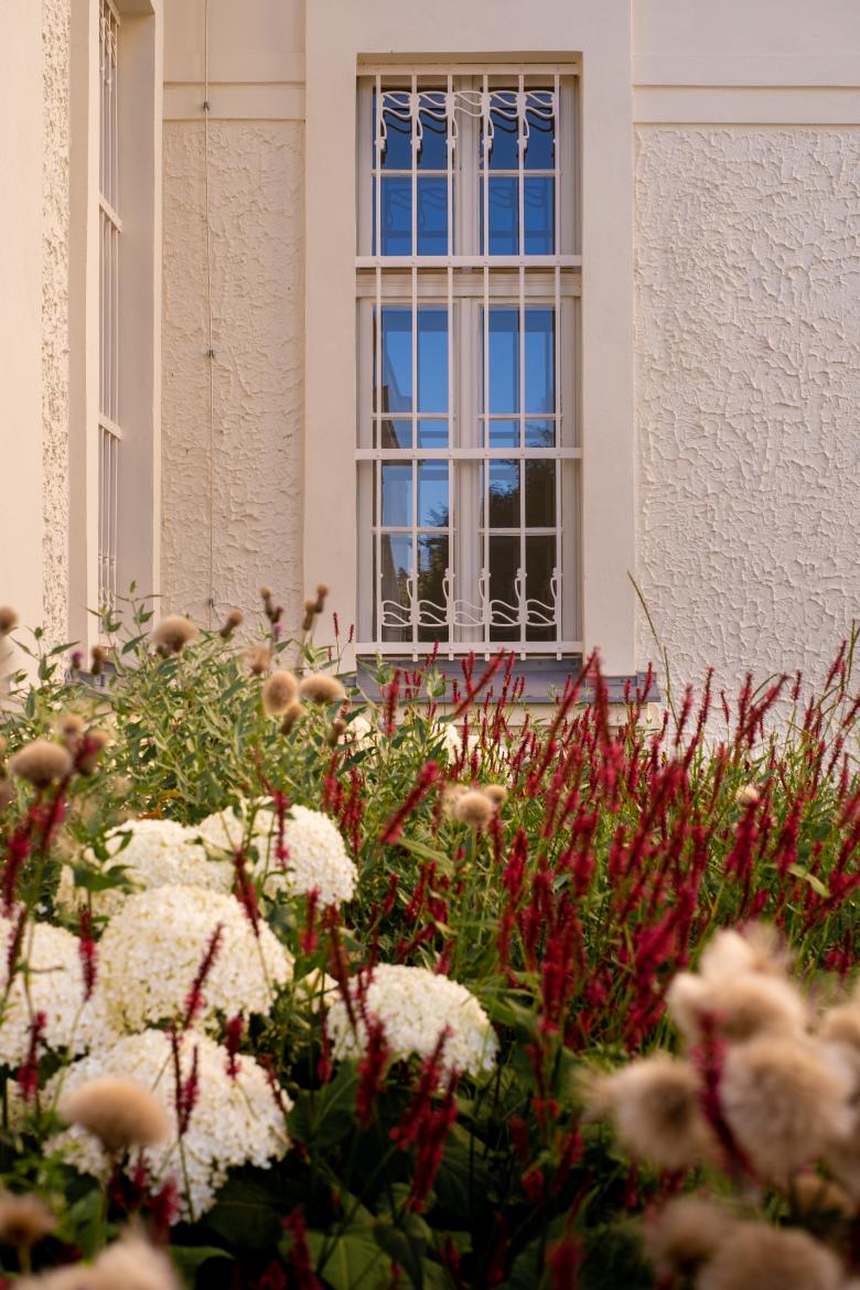 Eine großzügige Promenade aus gestrichenem Ortbeton mit kleineren Wegen erschließt die sieben Punkthäuser. Entlang der Hauptachse wird der Weg von einer gemischten Blütenhecke mit Eichblatthortensie, Blasenspiere, Perückenstrauch, Winter-Duftschneeball, Duftschneeball und Rotdorn gesäumt. Diese ist nicht nur dekorativ und spiegelt der Verlauf der Jahreszeiten wider, sondern ist zugleich Schutz für die anschließenden Eigengärten mit abkühlender Funktion. Zwischen den Stiegen 2 und 4 wurde ein kleiner Hof mit Spiel- und Aufenthaltsfunktionen errichtet, der mit einer Hainbuchenhecke umgrenzt wird. Bei den Zugängen zu den Stiegen 1 und 3 erweitert sich der Weg zu einem kleinen Platz, wo Bänke zum Verweilen und Plaudern einladen.