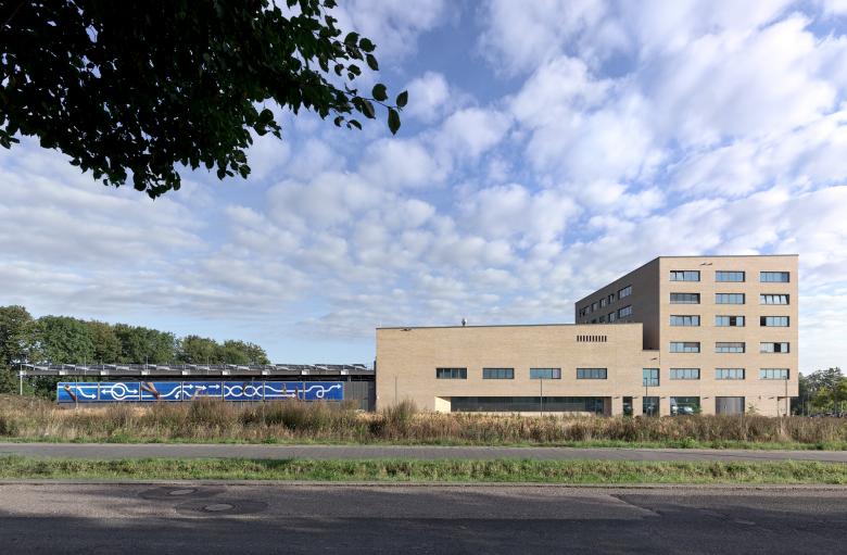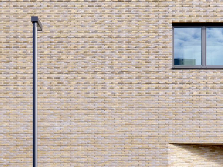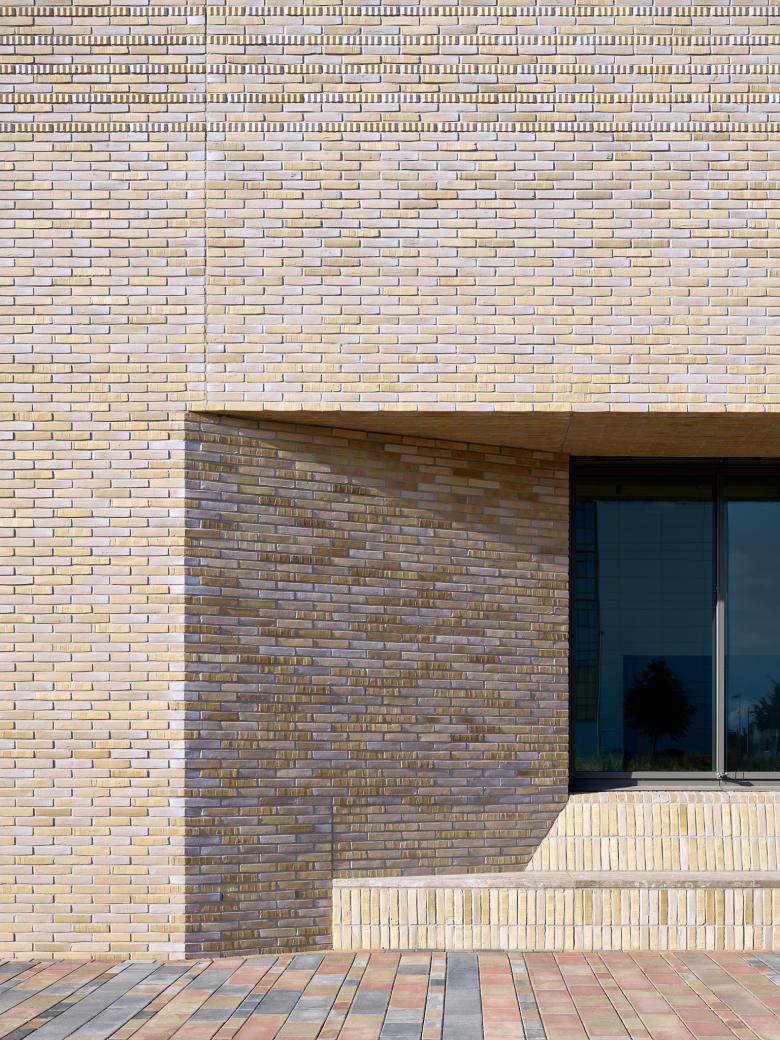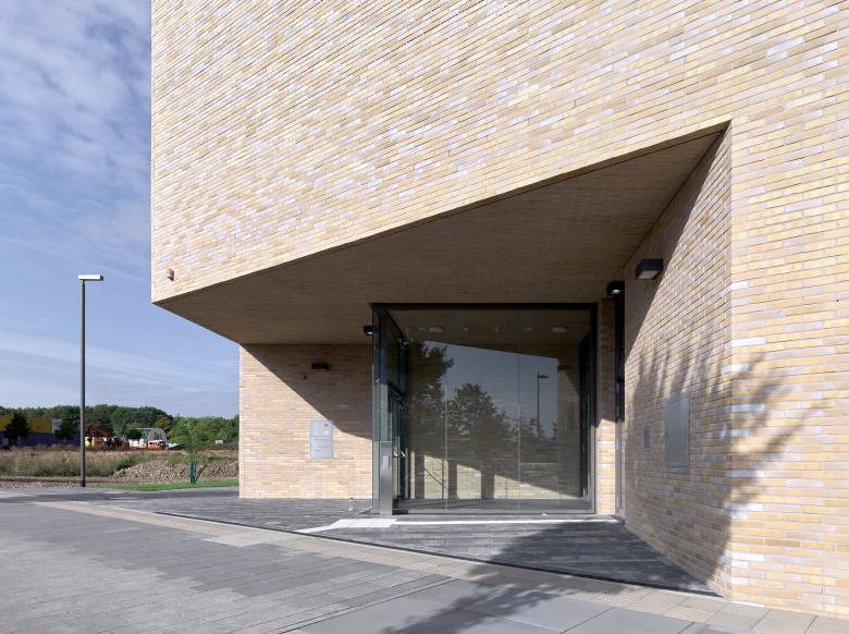 Um der Straßenkrümmung dynamisch zu folgen, wählten die Architekten einen Ziegel und knüpfen damit an die Materialität historischer Elektrizitätswerke an. Der nachhaltige Ziegel versinnbildlicht darüber hinaus den nachhaltigen Aspekt der Forschung und ermöglicht es, das Gebäude auf dem Campus angemessen zu adressieren. Während die Fassade an die Biegung des Boulevards angepasst ist, unterstreicht die architektonische Detaillierung der Fenster mit rhythmisch eingerückten Flächen die Dynamik der Ziegelfassade, ohne die Krümmungen auf das Glas übertragen zu müssen. Vorbeilaufende oder -fahrende Betrachter blicken durch ausladende Fensterfronten auf das Foyer mit angrenzenden Tagungsräumen und die Büros in den Obergeschossen.