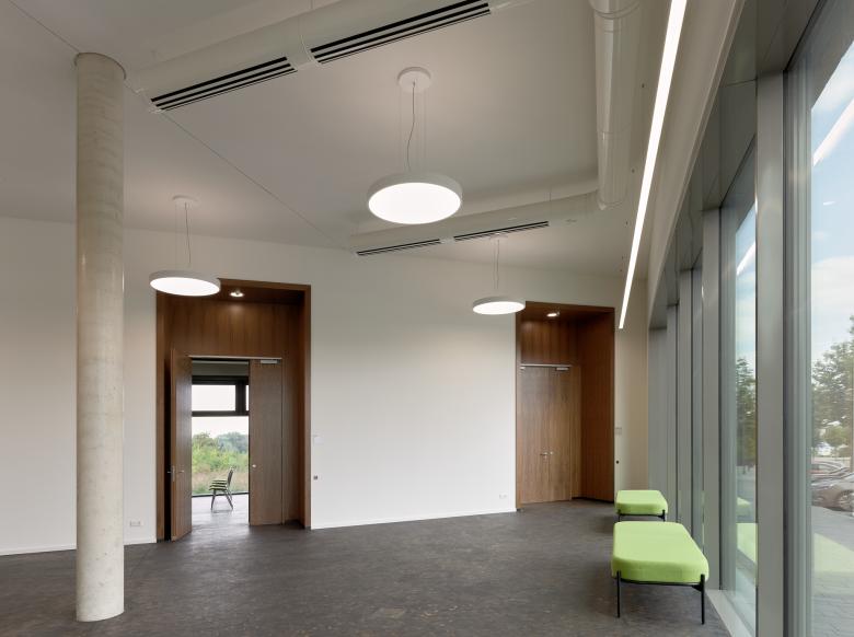 Der Mittelbau und die mit einer Stahlkonstruktion überdachte, offene Halle umschließen einen nördlich erschlossenen Betriebshof, so dass südlich des Gebäudes eine kommunikative und grüne Fußgängermagistrale inklusive Sitzgelegenheiten entstehen konnte.