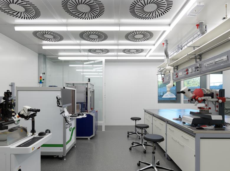 Das CARL besteht aus drei separaten Gebäudeteilen mit dem Hauptbau am Campus-Boulevard, einem massiven, dreigeschossigen Mittelteil mit kritischen Prüflaboren und einer überdachten Halle mit austauschbaren Raumzellen. Der Hauptbau, ein kompakter Baukörper ohne Innenhof, wird durch ein repräsentatives Haupttreppenhaus erschlossen, das mit geschwungenen Linien und Skulpturalität spielt, aber auch alle Anforderungen an den notwendigen Treppenraum erfüllt. Durch das große Oberlicht, das sich über dem gesamten Treppenauge befindet, wird Tageslicht in die tiefen Gebäudeteile geholt.