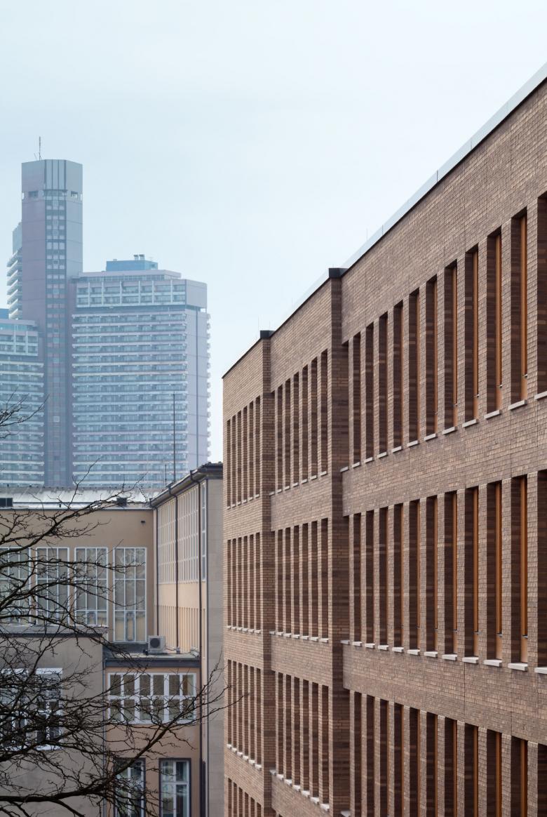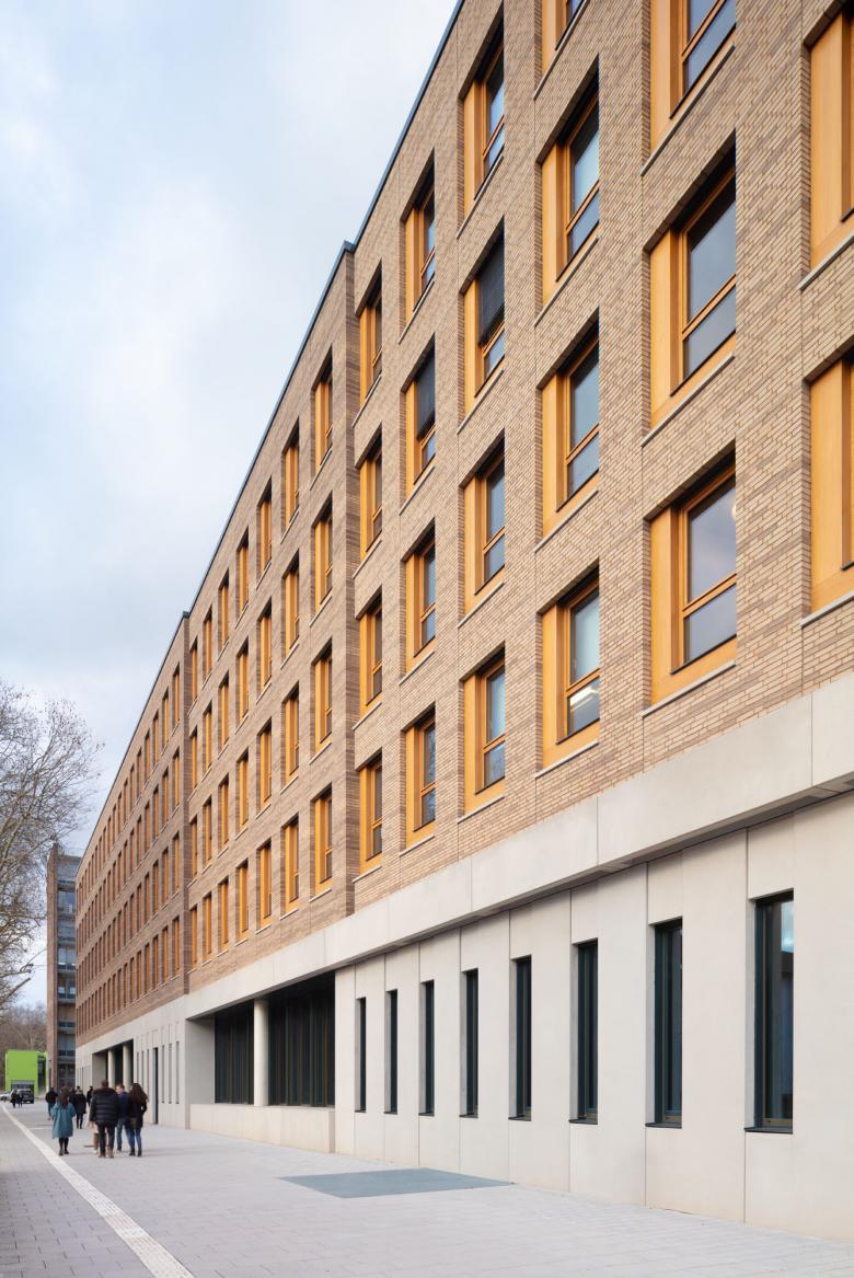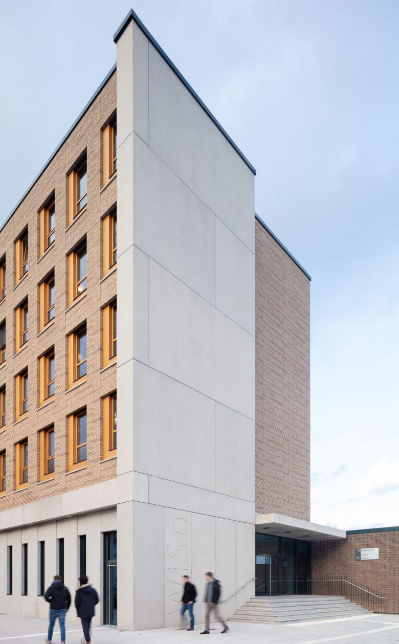 Der langgestreckte Neubau ist in zwei horizontale Zonen eingeteilt: Das Sockelgeschoss ist mit Betonfertigteilen verkleidet, welche einerseits die konstruktive Aufständerung deutlich werden lassen, andererseits mit großen Fensterrahmen Durchblicke auf den Altbau erlauben. Hier sind studentische Lernzonen eingerichtet. Die aufgehenden Geschosse sind als Referenz dem Riphahn-Gebäude gegenüber mit bräunlich-lehmfarbenem Ziegel verkleidet. Die Besonderheit sind die drei differenzierten Ziegelmischungen, die der vertikal gestaffelten Fassade einen subtilen Wechsel in der Farbintensität verleihen.