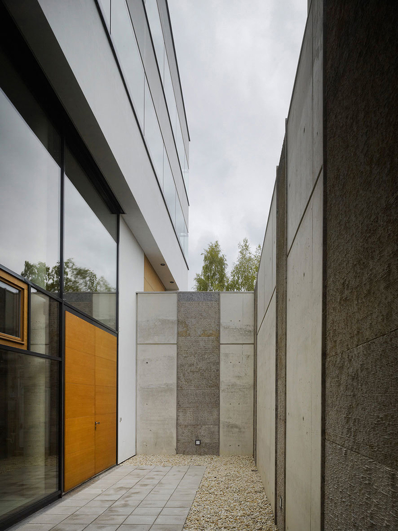Der dreigeschossige Neubau schließt an den historischen Bestand an. Der Anschluss zu Haus 1 wird mittels einer filigranen Glaskonstruktion geschaffen, durch eine zweite Brücke im Südosten wird das Thema des Übergangs erweitert.