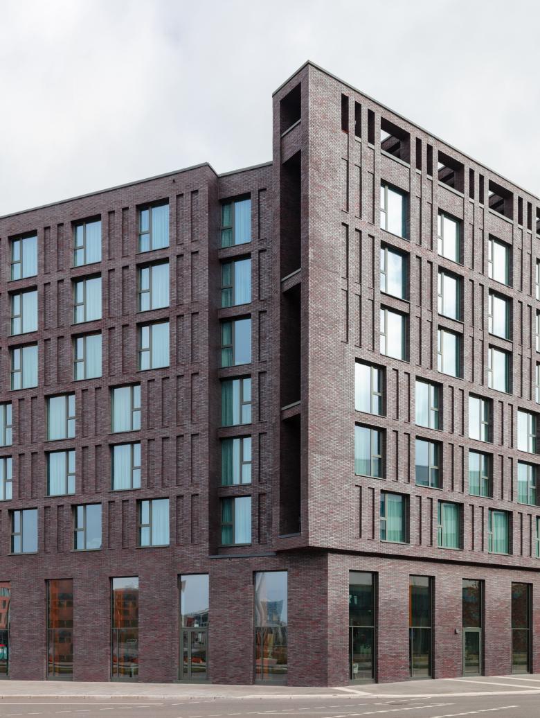 „Die Grundhaltung unseres Entwurfs besteht aus Konstanten und Variablen“, erläutert Johannes Kister. „Konstant sind die Materialität eines rotvioletten Ziegels und eine Fassadenstruktur aus Pfeilern und Wandvorlagen. Variabel ist die Adaption der Struktur in Bezug auf die Hotelzimmer. Dadurch gewinnt die Stapelung der Räume eine Tektonik der Fassade.“