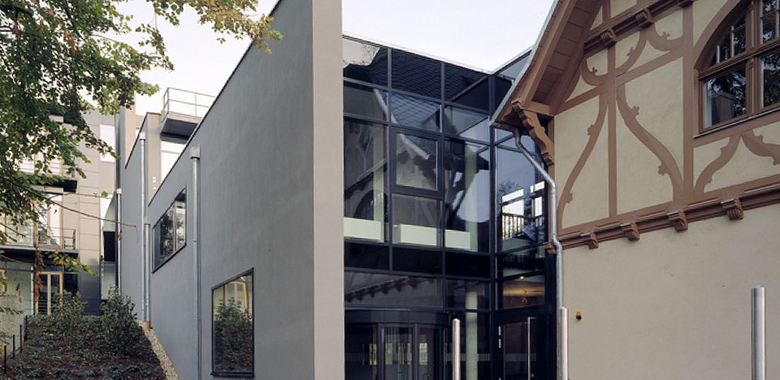 In einem gründerzeitlichen Wohnviertel liegt die ehemalige Fabrikantenvilla mit ihrem Erweiterungsbau inmitten eines großzügigen Parks. Gleich einem Solitär verlangte das denkmalgeschützte Bestandsgebäude vom Neubau einen besonderen Ansatz. So wird das neue Institutsgebäude ebenfalls als Villa definiert und städtebaulich zurückhaltend eingefügt. Das kubische Gebäude öffnet sich mit bodentiefen Verglasungen zu Villa und Park. Auskragende Deckenplatten aus schwarzem Sichtbeton unterbrechen die Glasfassade und lassen es leichter erscheinen.