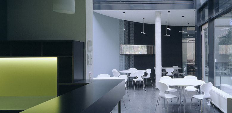 Auch im Inneren der beiden Gebäude wird der Übergang von Alt zu Neu betont. Während im Altbau Wandtäfelungen sowie erdige Farbtöne verwendet wurden, zeigt sich der Erweiterungsbau mit modernen Materialien in Grautönen. Florale Muster treten dabei dezent aus grauschwarzem Materialhintergründen hervor. Die Nahtstelle zwischen Villa sowie neuem Bibliotheks- und Bürogebäude ist geschickt funktionell durch Cafeteria und Haupteingang gefasst und wird zur Drehscheibe des gesamten Instituts.