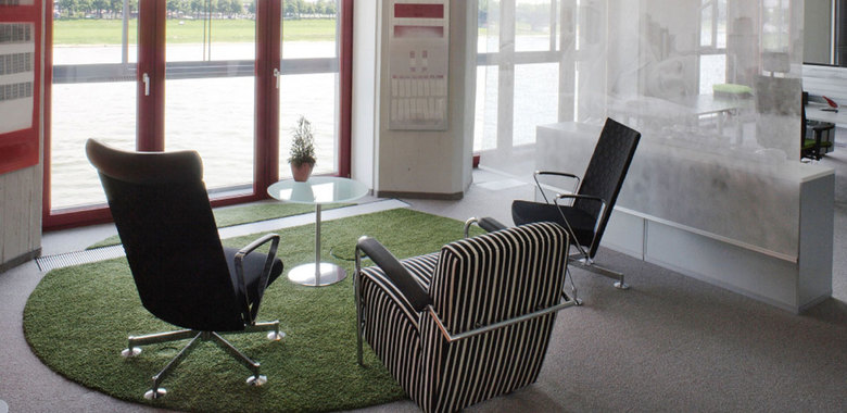 Die Schwierigkeit bei der Konversion lag in erster Linie in der Konstruktion des 1938-39 erbauten Speichers. Der nahezu fensterlose, turmartige Getreidespeicher besaß in voller Höhe durchlaufende Silotrichter. Aufgrund dessen entschieden sich kister scheithauer gross für die vollständige Entkernung des Gebäudes. Lediglich im Gastronomiebereich des Erdgeschosses blieben die Betontrichter als Gestaltungselement erhalten. In den entkernten Baukörper wurden zwölf flexibel nutzbare Bürogeschosse eingezogen. Als neue Elemente wurden in die geschlossene, rot verputzte Gebäudehülle große Fensteröffnungen eingeschnitten. Konische Betonfertigteile fassen die einzelnen Fensterflächen zu einer plastischen Rasterstruktur zusammen. Das sogenannte Bay-Window fungiert dabei als Doppelfassade mit Schutzfunktion: straßenseitig als Lärmwand - wasserseitig als Schutz vor der frischen Rheinbrise.