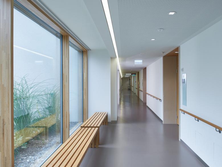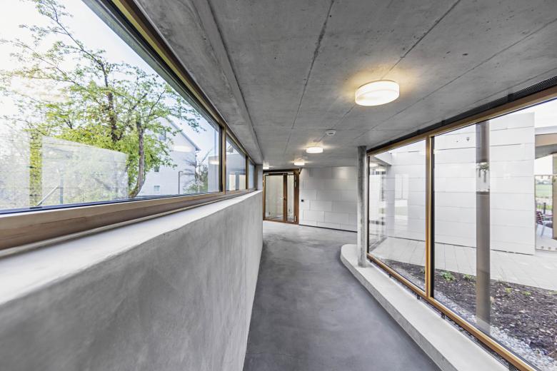 Der Erweiterungsbau schliesst als eingeschossiges Gebäude an einen bestehenden Massivbau an. Grossflächige Fensterpartien vor den Zimmertrakten und die geschuppte Aluminiumverkleidung der geschlossenen Fassadenflächen verleihen dem Neubau einen pavillonartigen Ausdruck. Er setzt sich dadurch präzis vom zweigeschossigen Altbau mit bestehendem Satteldach ab und ermöglicht eine klare Zonierung des Aussenraums in zwei stimmungsvolle Hofräume.
