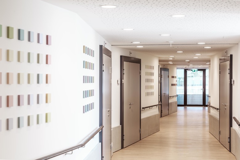 Das neue Gebäudevolumen ist leicht gestaffelt in der Fortsetzung der vorhandenen Fluchten des Altbaus angefügt. Die Eigenständigkeit des Neubaus in Form und Architektursprache und durch die Leichtigkeit und Raumhaltigkeit der Fassaden bildet die Erweiterung ein Gegenstück zum dominanten Altbau. Auf der Ostseite wird ein Bindeglied zwischen Alt- und Neubau eingefügt, welches die neuen Aufenthaltsräume der Wohngruppen beherbergt. Alle zentralen Nutzungen sind aufgrund der Übersichtlichkeit und bequemen Zugänglichkeit im Erdgeschoss angeordnet.