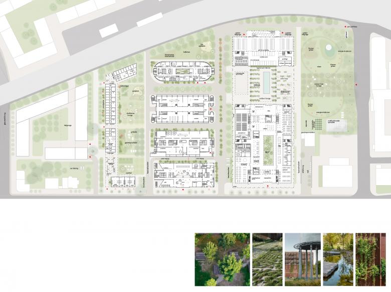 Der Ansatz des Entwurfs bildet vier Baufelder aus, die auch unabhängig voneinander entwickelt werden können: Im ersten Baufeld entsteht im Westen dringend benötigter, vermietbarer Wohnraum, der auch der allgemeinen Bevölkerung zugänglich sein soll. Auf dem zweiten Baufeld entstehen Werkswohnungen, durch die die Mainova ihre Attraktivität zur Gewinnung kompetenter MitarbeiterInnen und junger Talente erhöhen kann. Die Revitalisierung der Bestandsbauten erfolgt auf dem dritten Baufeld durch einen Umbau in den neuen ‚Energy Hub‘ und der ‚Mainova-Inkubator‘, in denen kleinere und größere Unternehmen, Start-Ups und Institute der Universitäten und Hochschulen an der Energie-Versorgung der Zukunft arbeiten können. Hier wird auch das ‚Mainova-Ausbildungszentrum‘ mit großer Konferenzfläche als Forschungs- und Entwicklungszentrum, eine Mainova-Kita und das Mainova-Sportcenter beheimatet sein. Potentielle GründerInnen mit überzeugenden Geschäftsideen sollen hier Unterstützung mit Infrastruktur, Co-Working-Räumen und Beratung erhalten. Diese Bauteile werden umgesetzt, wenn der Neubau ‚Mainova-Welt‘ und ‚Park der Energie‘ auf dem vierten Baufeld im Osten errichtet sind.