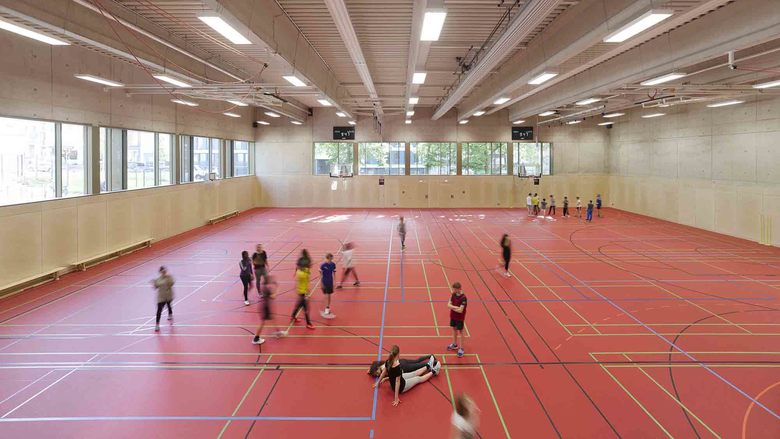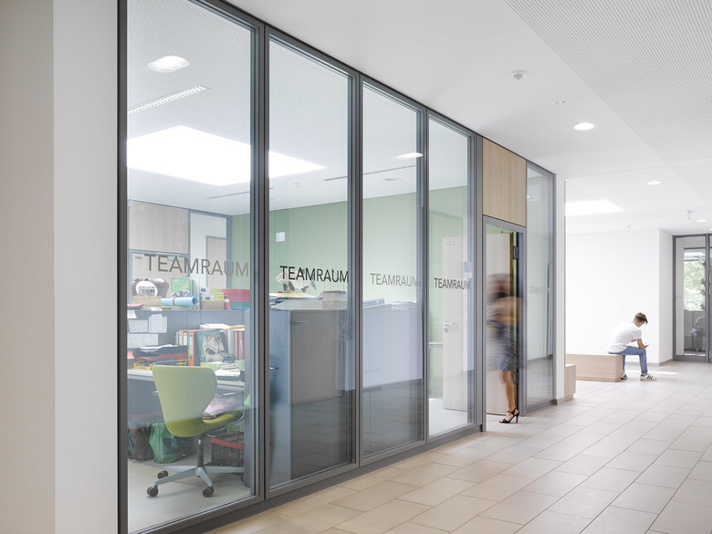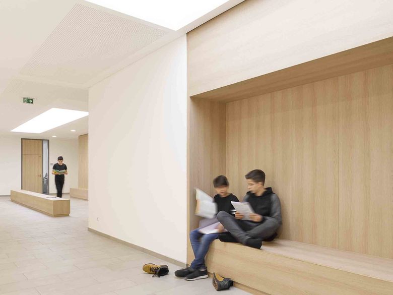 unterschiedlich gestaltete Räume voneinander. Herzstück der Teams sind die Teamquader – großflächig verglaste Räume, in welchen die Lehrer arbeiten, den Schülern jeder Zeit zur Verfügung stehen und ihnen größtmögliche Transparenz bieten. Sitznischen sowie Lerninseln in den Fluren unterstützen diese gemeinschaftliche Lernatmosphäre und schaffen eine hohe Aufenthaltsqualität.