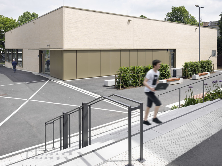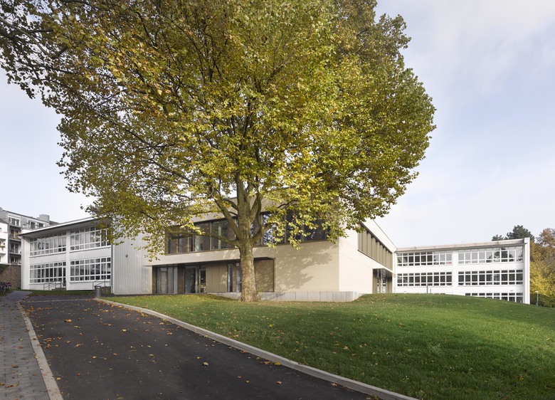 Auf dem Areal bleiben die beiden Bestandsgebäude – die „Turmhäuser“– erhalten. Der zwischen ihnen platzierte Neubau vervollständigt nicht nur das städtebauliche Gesamtkonzept, sondern stellt auch das funktionale Bindeglied dar. Auch der Neubau der Sporthalle legt sich bewusst in die Bautenfolge und unterstützt den Zuweg zum Schulkomplex.