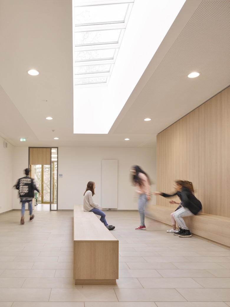 Die gemeinschaftlich genutzten Bereiche im Neubau von Foyer, Mensa sowie Mensagarten sind Kommunikationsflächen für das gesamte Ensemble. Große Glasflächen ermöglichen die Verbindung von Innen- und Außenraum und setzen die helle und positive Lernatmosphäre im Neubau fort.