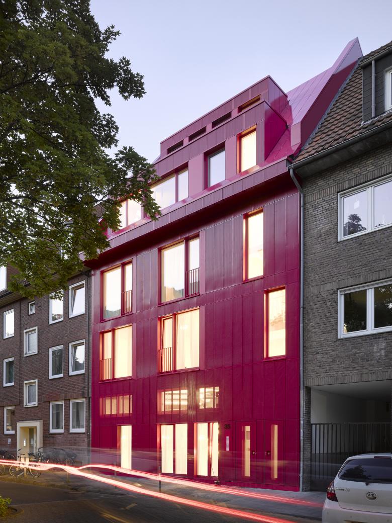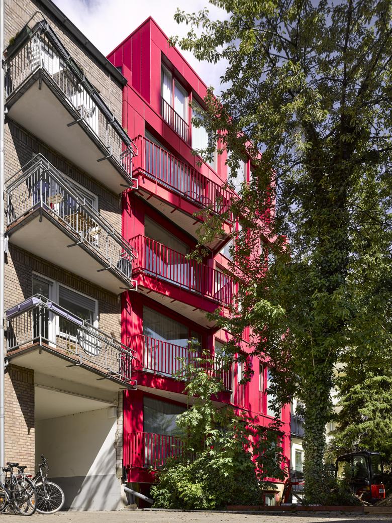 Auch setzen die beiden stark auf Farbe, was Ihrer Meinung nach das Viertel sehr gut vertragen kann. Neben den roten Backstein sowie gedeckten Farben der Putzbauten sticht das Himbeerrot leicht hervor. Das ehemaligen Arbeiterviertel bekommt damit einen neuen Baustein, der von Innen heraus kommt und sich klar zur eigenen Familie und Herkunft bekennt.