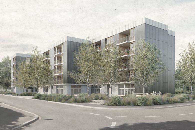 Der gestaffelte Gebäudekörper komplettiert das grossmassstäblich bebaute Quartier. Es entstehen unterschiedliche Aussenräume - ein baumbestandener Vorplatz an der Kreuzung und ein üppiger Garten entlang der Gleise. Die Wohnräume öffnen sich stadtseitig auf eine Loggia und bahnseitig auf einen Küchenbalkon. Die Zimmer bilden jeweils mit Vorraum und Bad eine Einheit, was unterschiedliche Wohnsituationen erlaubt. Vertikal zusammengefasste Fenster und Loggien gliedern die mit Fotovoltaikgläsern verkleidete Fassade.