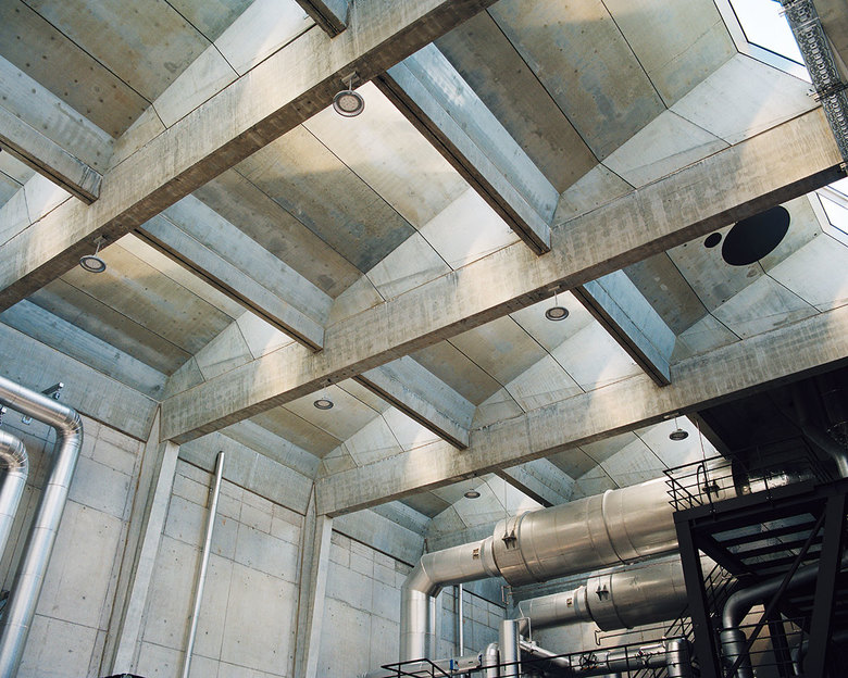 Die neue Fernwärmezentrale Waldau mit Salzhalle steht als freigestellter Baukörper im ehemaligen Werkhofareal beim Waldaupärkli in St. Gallen. Das neue Gebäude gleicht in seinem äusseren Erscheinungsbild einer Industriehalle. Das Bauwerk verfügt über eine Länge von rund 48 m, eine Breite von 18 m sowie eine Höhe von rund 12 m. Das teilunterkellerte Hallentragwerk gliedert sich in einfeldrige Zweigelenk-Querrahmen im Abstand von 6.0 m, Ausfachungen der Rahmen entlang der Fassadenflächen und Sheddachelemente mit quadratischem Grundriss 6.0 x 6.0 m. Die Querrahmen und Sheddachschalen wurden aus vorgefertigten Betonelementen in Montagebauweise realisiert, während die übrigen Tragwerkselemente in Ortbetonbauweise erstellt wurden. Die Tragstruktur in Massivbauweise gewährleistet den Witterungsschutz der Anlage und dient dem Schutz der Umgebung vor Schallemissionen, die durch den Betrieb der Dieselgeneratoren verursacht werden. Über dem in konventioneller Ortbetonbauweise erstellten Untergeschoss sorgen Rahmen, montiert aus drei biegesteif verbundenen, vorfabrizierten Betonelementen, für den vertikalen Lastabtrag aus der Dachfläche und die Stabilisierung der Halle in Querrichtung. Zwischen den Stielen der vorfabrizierten Betonrahmen wurden als Aussenwände Ausfachungen aus gestocktem Recyclingbeton mit Mischabbruchzuschlägen (RC-M-Beton) in Sichtbetonqualität eingesetzt. Die Dacheindeckung aus sich selbst tragenden, dünnen Betonschalen mit 15 cm Bauteildicke wurde ebenfalls vorgängig im Werk hergestellt. Durch den Einsatz der Vorfabrikation entfielen aufwendige, in grosser Höhe zu erstellende Schalungsarbeiten, was eine besonders wirtschaftliche Ausführung der Bauarbeiten gewährleistete.