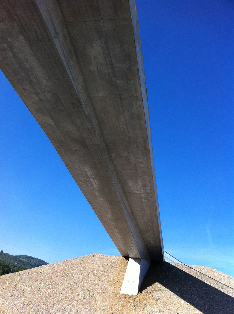 Die Brücke ist als Zweigelenkrahmen konzipiert. Die Fahrbahn bildet den Rahmenriegel und wurde als ein in Längsrichtung vorgespannter Plattenbalken in Stahlbeton ausgeführt. Die Stiele des Rahmens sind als schlaff bewehrte Stützen gelenkig ins Fundament eingebunden. Die Querschnitte von Riegel und Stielen sind in ihren Abmessungen veränderlich und passen sich so der jeweiligen Beanspruchung an. Die sichtbaren Betonoberflächen wurden in Sichtbetonqualität hergestellt. Um die hohen Spannungen in den schlanken Betonquerschnitten aufnehmen zu können, wurde die gesamte Brücke mit einem hochfesten Beton C50/60 realisiert.