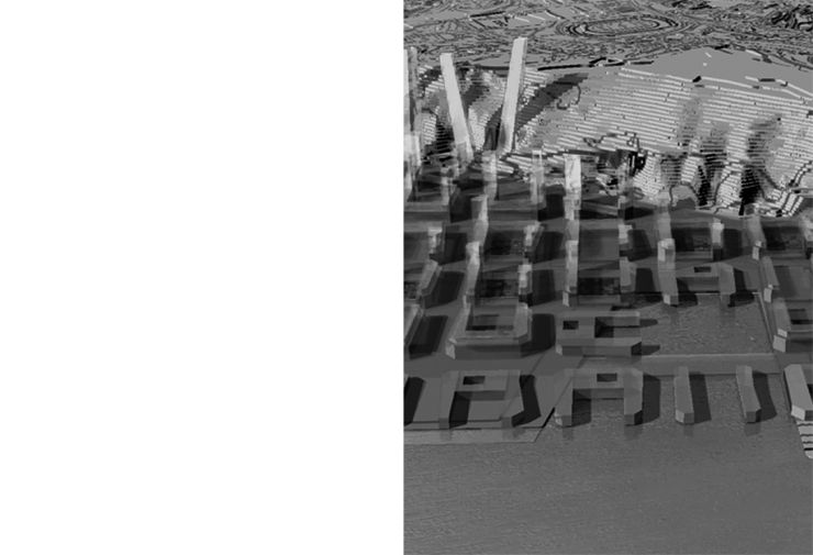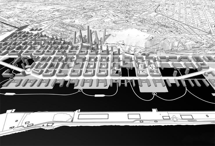 The project was conceived as an opportunity to rethink the city's new strategic extension that connects the maritime existing district but mainly the new city district that built based on the concept of urban dimensional. The current port area facilities obsolete, giving way to a new city and a new productive residential net projected from a new layers project of a symbiotic overlay.