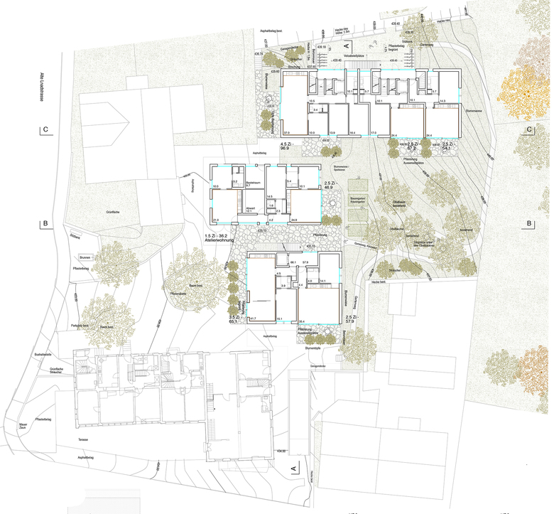 Ein historisches Ensemble aus Wohnhaus, Scheune, Gartenhalle und altem Obsthain wird umgenutzt und mit Wohnungen erweitert. Das Konzept sieht eine sanfte Integration der Wohnüberbauung in den durchgrünten Raum vor, der lauschige Ort soll seine Atmosphäre bewahren. Der Obsthain im gemeinschaftlichen Hof bleibt weitgehend erhalten. Alte Obstsorten und die grosszügige Wiesenfläche mit unterschiedlichen Ansaaten verleihen der Gestaltung einen hohen ökologischen Wert.