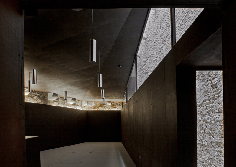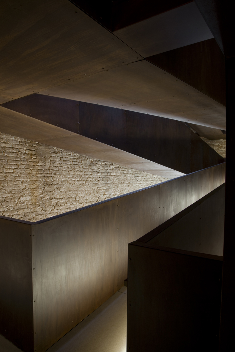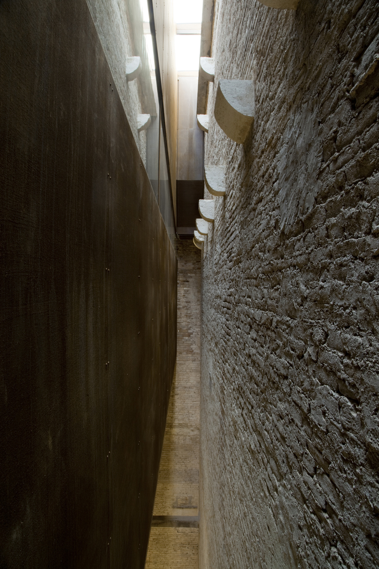 The partitions defines the new distribution and volumes necessary for hosting the main plant equipment are made as separate and recognizable elements in comparison with the original structures. The lift systems are always volumetrically independent of the existing bricked walls. The materials used (exposed concrete, fiber cement panels for the flooring, sheets of waxed cor-ten steel) are always dialoguing in contrasted texture and pattern with existing ones.