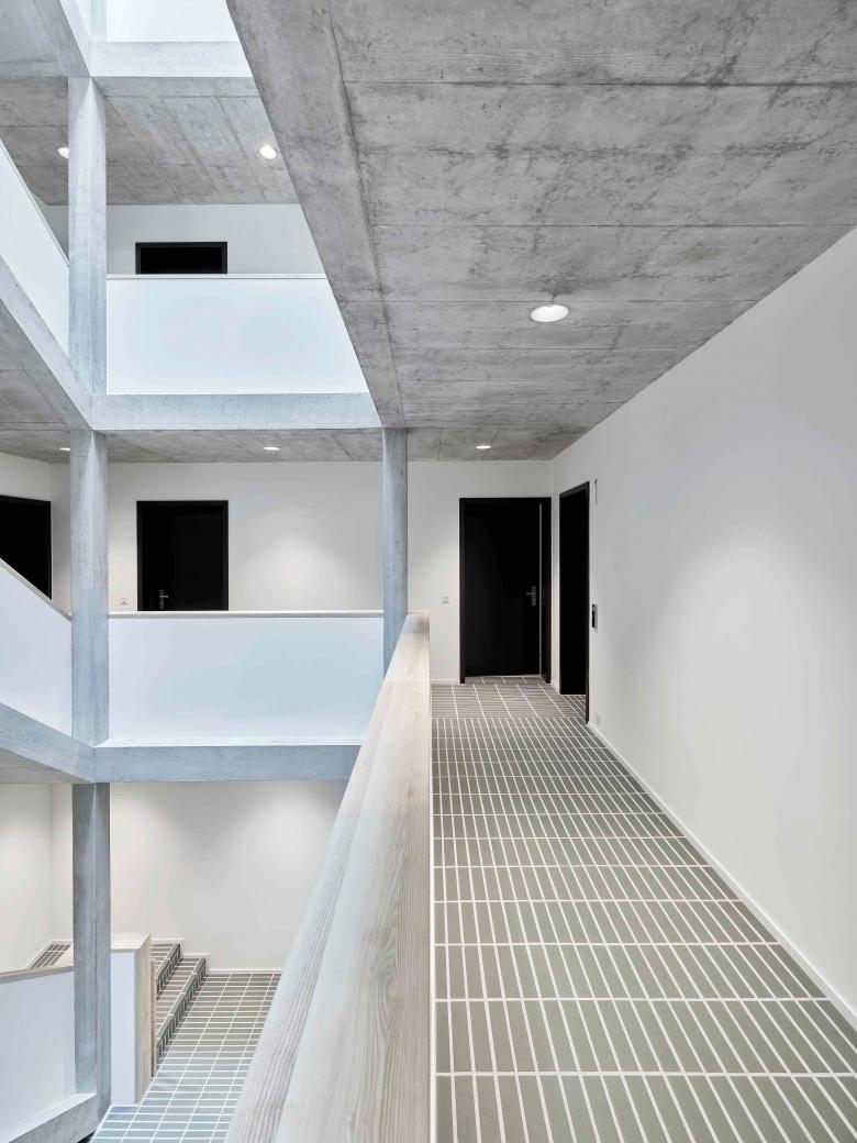Das Gebäude ist typologisch kompakt um einen Kern herum organisiert, welcher als Lichthof mit einer durchgehenden Galerie, einer Treppenanlage und einem Aufzug gestaltet ist. Im Erdgeschoss befinden sich die Einfahrt in die Tiefgarage, die Fahrradabstellplätze, ein Haupteingang mit den Briefkästen sowie eine zum Garten orientierte Praxis-Fläche von ca. 250 m2. Der Grundriss besteht aus vier ca. 98 m2 grossen 3 ½ Zimmer-Eckwohnungen und zwei ca. 61 m2 grossen 2 ½ Zimmer-Wohnungen und erstreckt sich vom ersten bis zum fünften Obergeschoss.