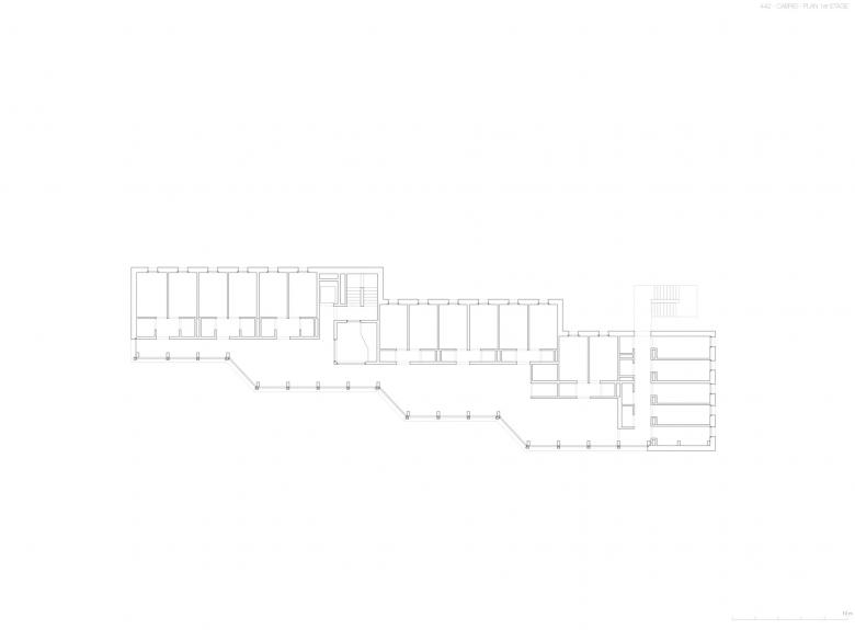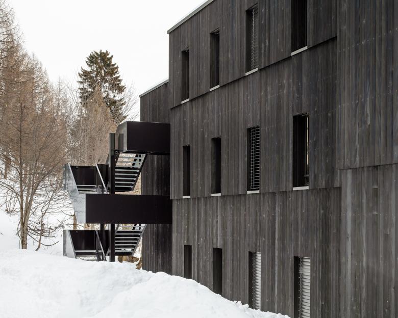 A l’image des établissements de soins pour enfants caractérisant le lieu, le projet s’implante en étirant une grande coursive sur la largeur de la parcelle. Il profite ainsi au maximum de l’orientation solaire et visuelle de la situation. Par de légers déboitements le volume produit des dégagements vers le grand paysage caractérisé par la présence des célèbres Dents-du-Midi. Cette coursive ensoleillée tournée vers les crêtes alpines offre de multiples possibilités d’appropriation pour les groupes qui y séjourneront : salons d’étage, mur de grimpe, salle polyvalente, bars, ...