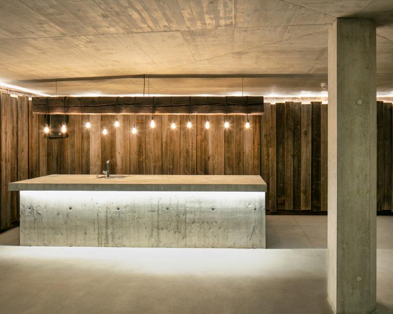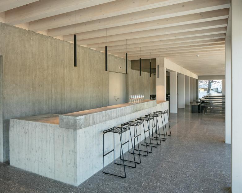 La construction se veut simple et locale dans une ambiance qui s’apparente à la fois au refuge de montagne et à quelques éléments de confort hôtelier. La matérialité est axée principalement sur le bois allié aux cailloux du Rhône clairsemés sur le sol ou intégrés à quelques murs en béton comme pour se protéger de la neige et proposer un moment d’ouverture.