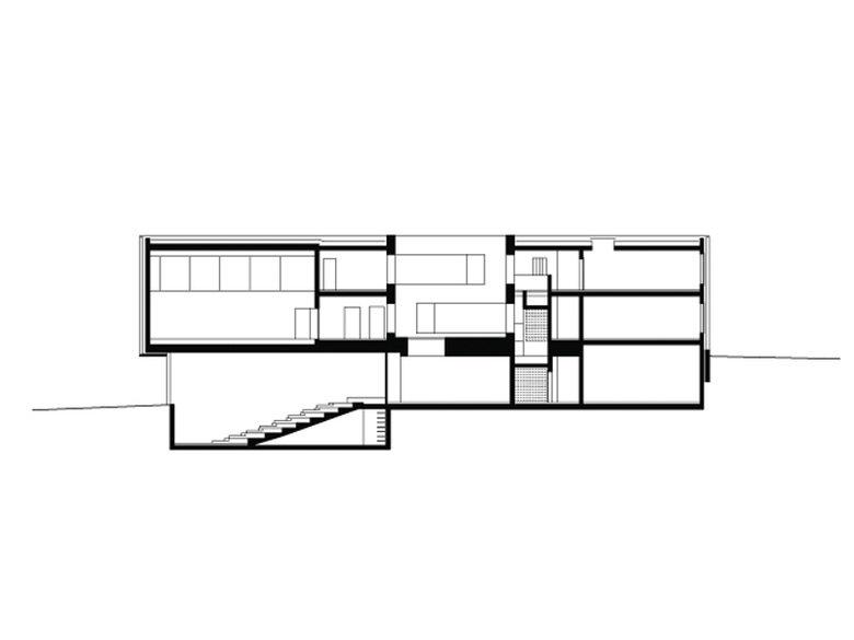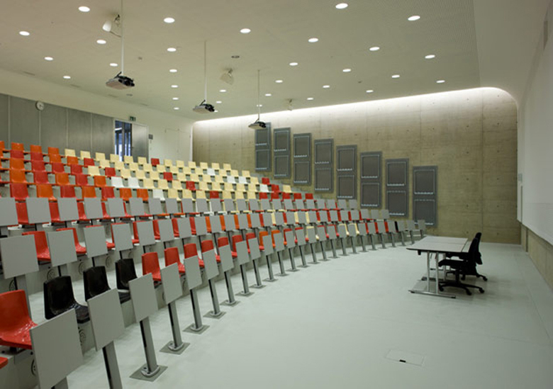 Au rez-de-chaussée un grand foyer ouvert sur l’extérieur distribue d’un côté la montée dans les étages et, de l’autre, l’auditoire de deux-cents places. Ce dernier est conçu comme un volume simple en béton, avec une feuille de plâtre qui se plie pour façonner, dans un mouvement unique, le faux plafond acoustique et la surface de projection. La disposition polychromatique des sièges de la salle a été conçue par l’artiste Daniel Schlaepfer. Les deux étages supérieurs sont articulés autour d’un patio intérieur à ciel ouvert et accueillent l’ensemble des locaux d’instruction et des bureaux.