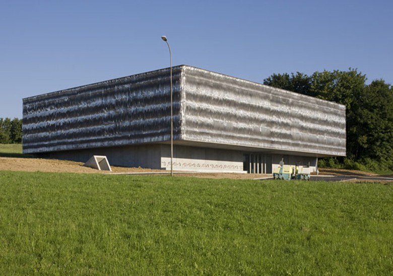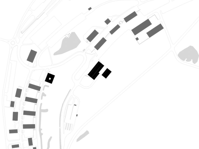 Le bâtiment d’instruction du nouveau «centre d’instruction au combat» se positionne en terminaison d’un cordon boisé, à l’est du chemin piétonnier qui dessert le haut des casernes existantes. Il se place sur le parcours des soldats et marque clairement un point d’articulation dans le lieu par son implantation, une espèce de repère dans le site. Le projet s’exprime à travers une volumétrie pure et abstraite, en étant composé d’un socle en béton armé partiellement enterré, sur lequel est posée, en décalage, une «boîte» recouverte d’une résille métallique formant le porte-à-faux d’entrée.