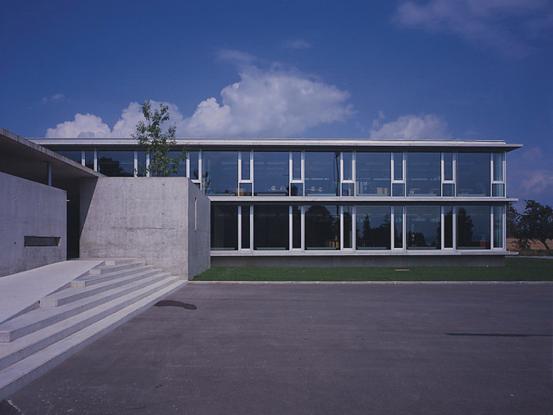 Le nouveau collège du Chaucey s’implante parallèlement à l’école existante tout en reliant les deux constructions par un couvert. Ce dernier définit une nouvelle zone de préau, ouverte sur le parc du château de Coppet et abritée du vent du nord par deux «murs écran», dont le décalage marque l’entrée principale au complexe scolaire.