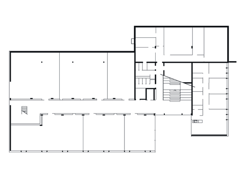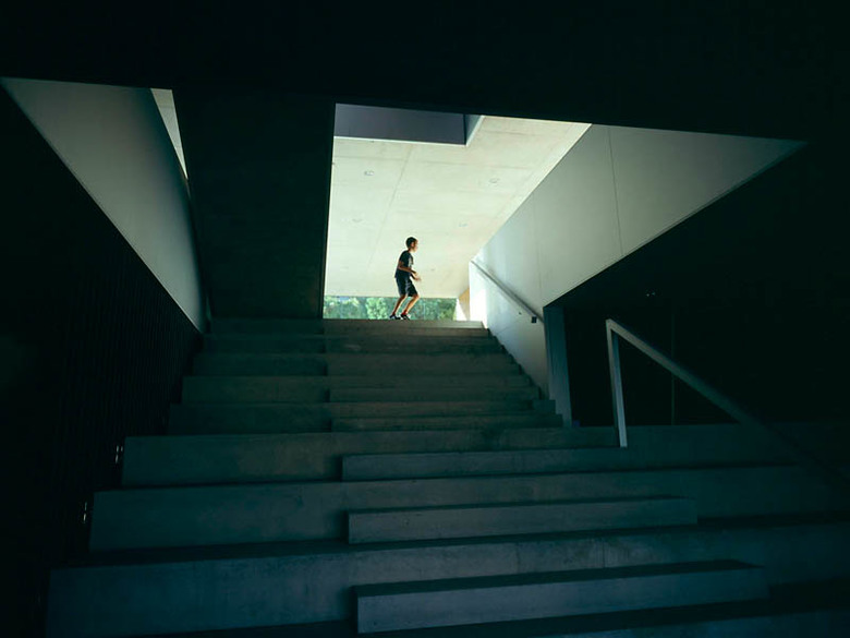L’école devient alors un microcosme urbain: une distribution principale qui traverse le bâtiment de part en part sur trois niveaux, des couloirs comme des rues intérieures, des espaces de pause en regard sur l’extérieur, deux entrées principales se rejoignant dans un gradin en béton. Le plan de l’édifice scolaire est caractérisé par un choix d’orientation des classes en fonction des différentes vues sur le paysage.