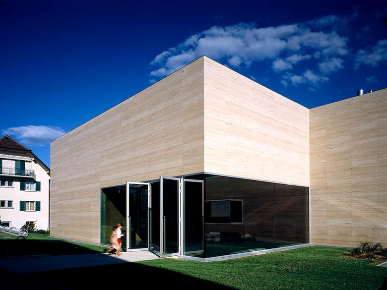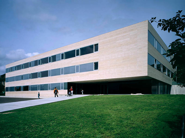 Le collège secondaire «Les Pressoirs» s’insère dans une parcelle en aval du village de Lonay. Ici, dans un coteau orienté sur le lac et les Alpes, l’autoroute et les voies ferrées tracent des sillons parallèles dans un territoire au pied d’un ultime pli du Jura. Le projet est conçu comme un volume pur en pierre, scarifié par de longues lignes horizontales en verre qui invitent ce paysage à l’intérieur. A l’angle sud-est, le prisme s’interrompt pour laisser place à un porte-à-faux qui accueille les élèves venant de la route principale.