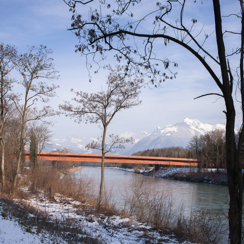Le concept retenu met en place un objet continu qui exprime la répartition des efforts statiques mis en jeu. L’unité de la forme permet d’«enjamber» les irrégularités de la terre et d’interagir dans ce lieu de manière raisonnée par une augmentation progressive de la portée, basée sur le principe mathématique des courbes harmoniques. Les soixante-quatorze mètres nécessaires au franchissement du Rhône sont ainsi intégrés dans cette logique, quasi mathématique, où l’effort maximum se fond «naturellement» dans l’unité de l’ouvrage d’art, sans effort visuel particulier. Le béton qui compose la matérialité du pont est teinté, afin d’inscrire une «ligne rouge» dans le territoire.